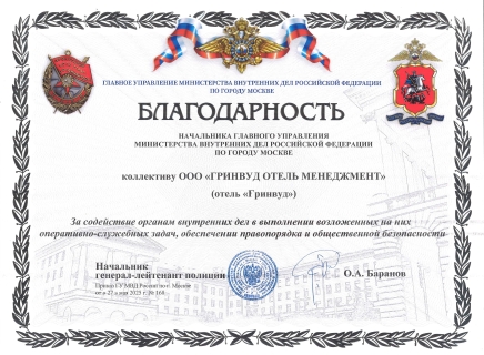 格林伍德酒店则因在纪念苏联伟大卫国战争胜利80周年庆典期间,出色完成俄罗斯莫斯科市内务局工作人员的接待保障任务而获颁荣誉奖状。面对规模大、标准高的保障要求,酒店凭借专业团队、完善设施和高效管理,为俄内务部人员提供了安全舒适的住宿环境和精准周到的餐饮服务,有力保障了庆典活动的顺利进行。